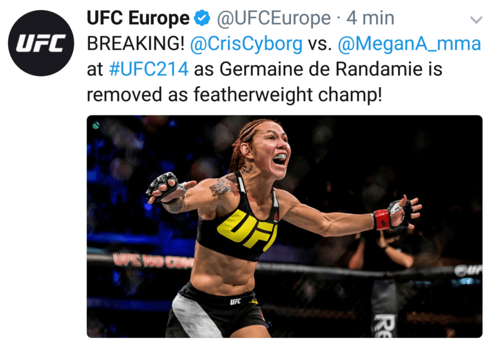 In a highly controversial and, frankly, ridiculous moment, the UFC tweeted then deleted the announcement that Cyborg and Megan Anderson had been booked to fight for the title and GDR was stripped.