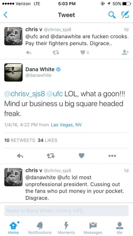 Dana WHite, however, kept it classy. He didn’t have much to say in regards to the fights, but he went NUTS at fans on Twitter this week: