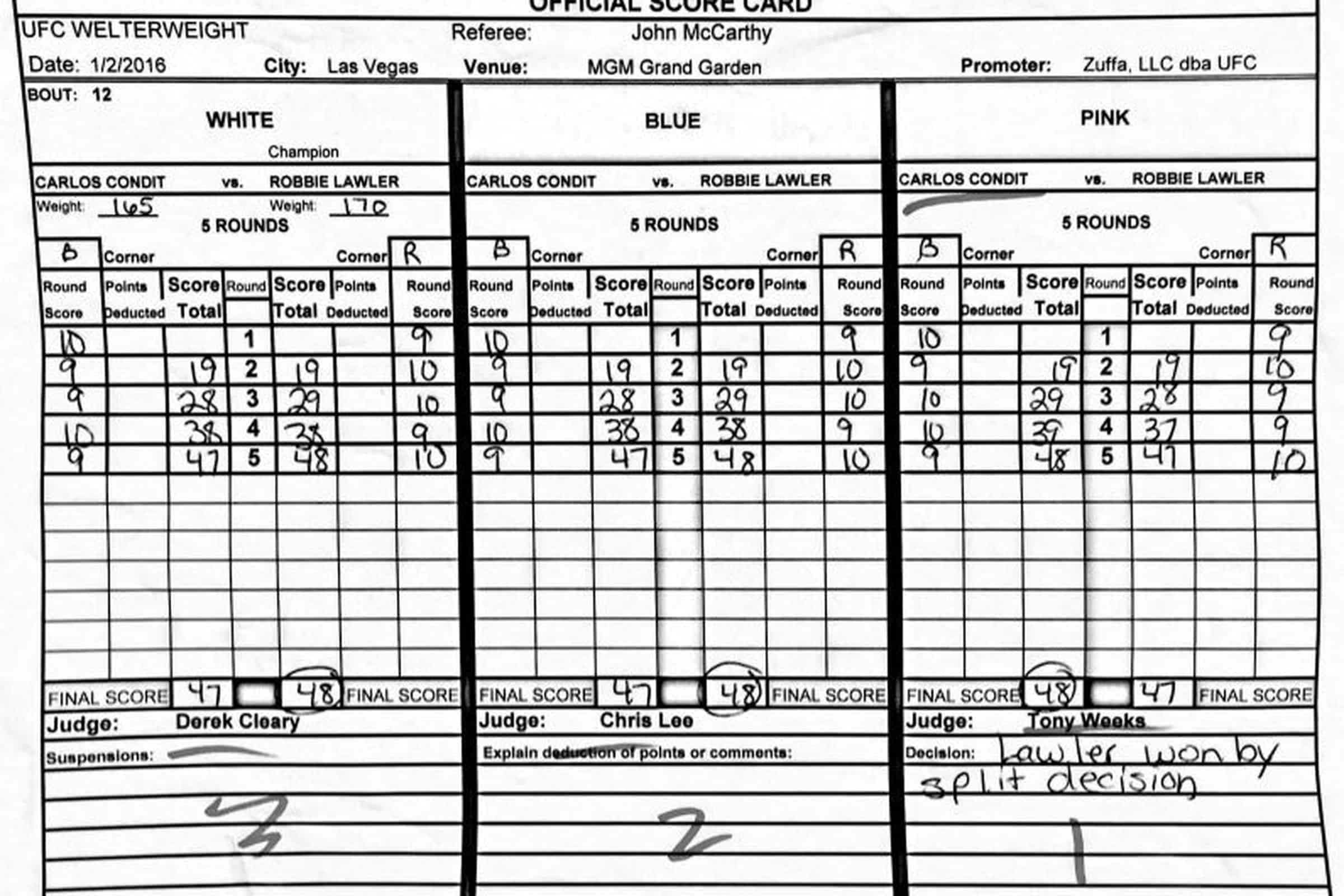 The scorecards for the UFC 195 main event between Robbie Lawler and Carlos Condit, and below is the reaction from Joe Rogan: