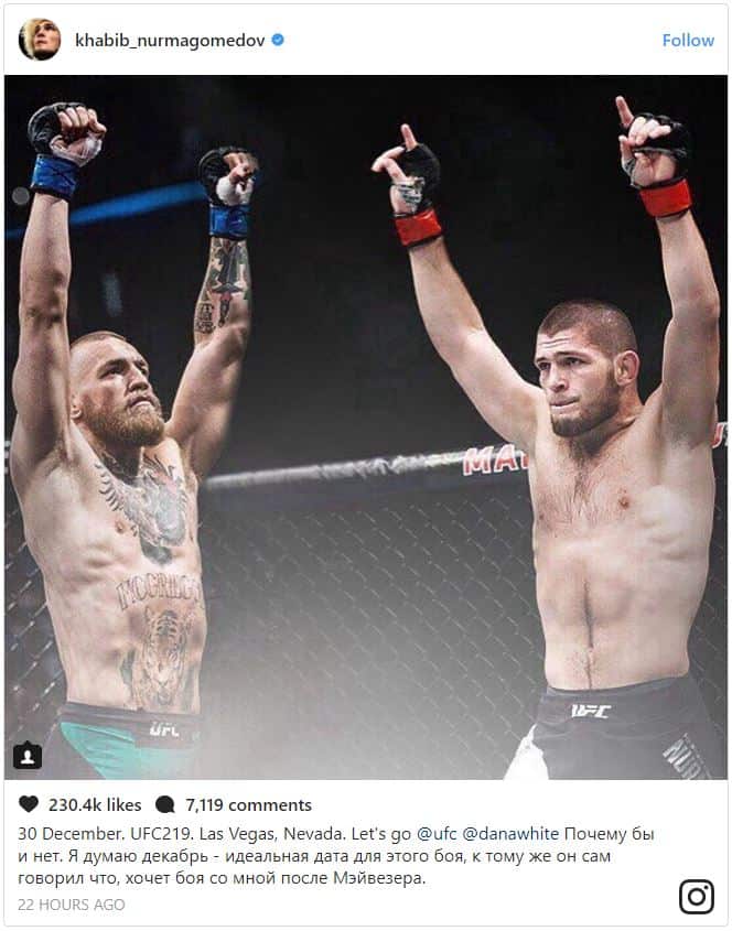 The Eagle’s post in Russian translates to: “30 December. UFC219. Las Vegas, Nevada. Let’s go @ufc @danawhite Why not. I think December is the perfect date for this fight, besides, he himself said that he wants a fight with me after Mayweather.”