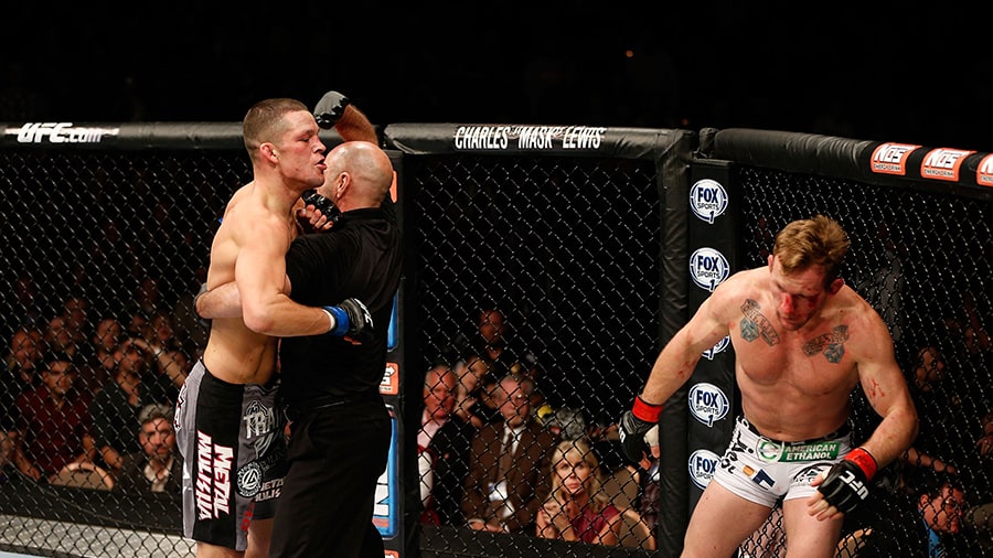 It was coming up on one year since Nate lost his UFC lightweight title shot against Benson Henderson on December 8th 2012. Nate followed that loss with his first ever KO loss to Josh Thomson on April 20th 2013 (evidently he was not motivated to win on 4/20).
