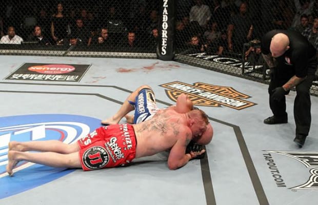 Lesnar’s showdown with Carwin at UFC 116 in 2010 was a real treat for heavyweight fans. These two enormous physical specimens were at the top of their games. Lesnar was coming off a huge revenge win over Frank Mir at UFC 100. Carwin was a perfect 12-0 and had been demolishing all of his opponents inside the first round.