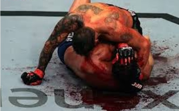 From his back, Ray managed to land a big elbow and it sliced Dewees open badly and immediately started pouring blood out as if someone had just turned on a tap.