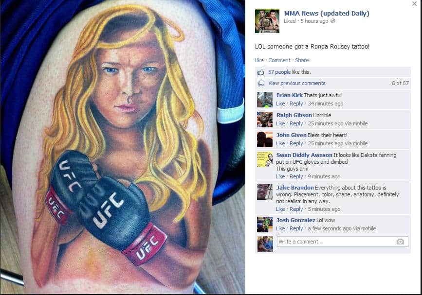 Conor McGregor tattoos seemed to be all the rage for quite a while. Also former women’s bantamweight champion Ronda Rousey has been the subject of many terrible tats. After both their losses, perhaps some of these die hard fans are thinking of laser treatment?