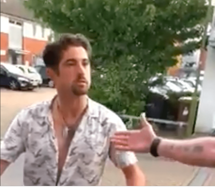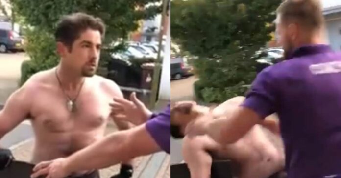 The idiot doesn’t take the hint though and steps it up a level by taking off his shirt. One of the children starts crying – and we don’t blame the kid, that’s a very hairy chest. All credit to the dad because he’s incredibly restrained, doing his utmost to de-escalate the situation in front of his family while protecting them and his property. He says:
