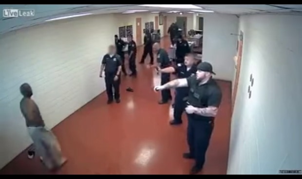 Today’s story focuses on a video that is doing the rounds this week. Captured on CCTV, an enraged prisoner takes on a crowd of corrections officers as they try to calm him down.